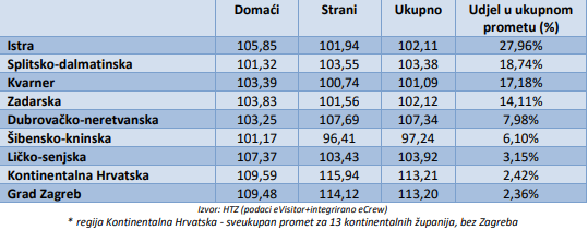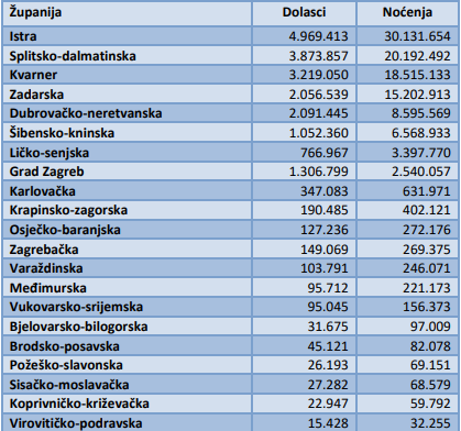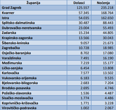 Predvode, po broju noćenja i dolazaka, Istra, Splitsko-dalmatinska županija, Kvarner, Zadarska te Dubrovačko-neretvanska županija. Gleda li se samo kontinentalni dio zemlje, nakon Zagreba, najviše dolazaka imala je Karlovačka županija, pa Krapinsko- zagorska, Zagrebačka, Osječko-baranjska i Varaždinska županija. Po broju noćenja predvode također Karlovačka i Krapinsko-zagorska županija, a slijede Osječko-baranjska, Zagrebačka i Varaždinska županija. Iza njih odmah slijede Međimurska i Vukovarsko-srijemska županija.