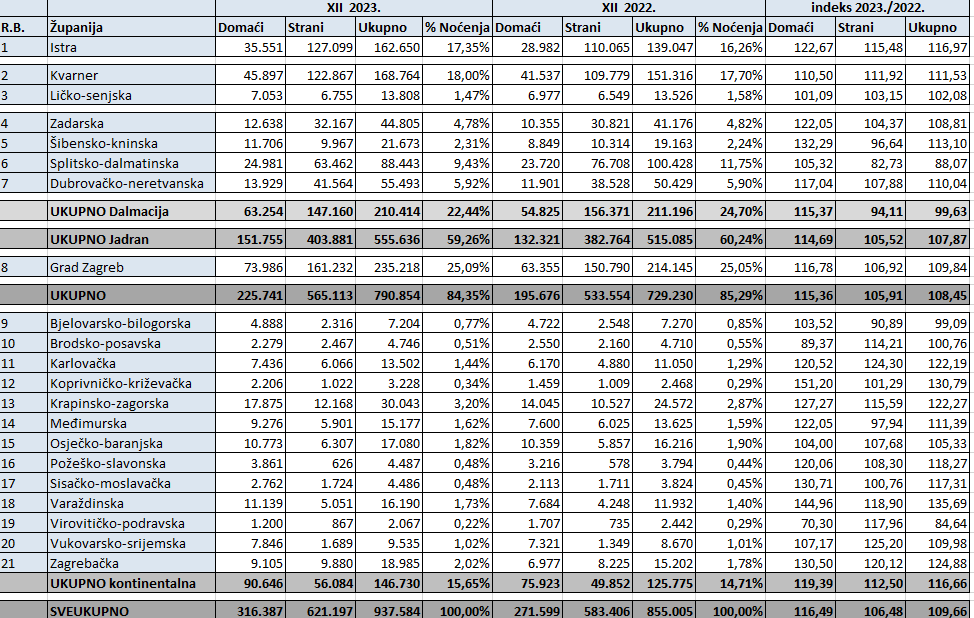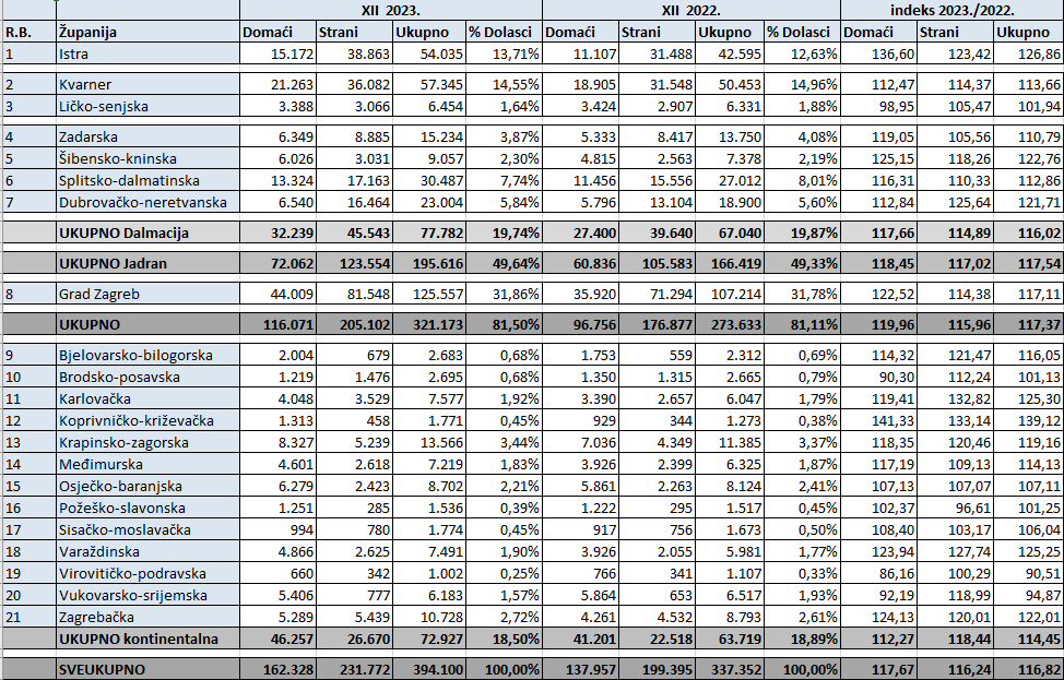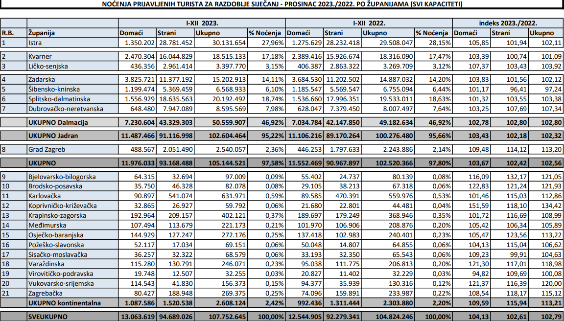 Tijekom cijele prošle godine broj dolazaka stranih turista iznosio je 17.789.895, 10 posto više nego godinu prije, dok je broj dolazaka domaćih turista istovremeno iznosio 2.823.602, što je 7 posto više nego u 2022. godini. U istom vremenskom razdoblju ostvareno je 94.689.026 noćenja stranih turista, 3 posto više nego godinu prije, kao i 13.063.619 noćenja domaćih turista, 4 posto više na godišnjoj razini. Sveukupni (strani i domaći) broj dolazaka u razdoblju siječanj-prosinac iznosio je 20.613.497, 9 posto više na godišnjoj razini, a istovremeno je zabilježeno 107.752.645 sveukupnih noćenja, 3 posto više u odnosu na 2022. godinu.