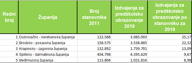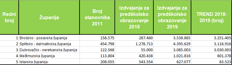 Što se tiče trenda, naša je analiza temeljena na podacima konsolidiranih proračuna pokazala da je u apsolutnim brojevima najveći porast izdvojenih sredstava za predškolski odgoj imala Brodsko-posavska županija, 3,2 milijuna kuna, pa Splitsko-dalmatinska sa 3,1 milijun kuna više sredstava iz proračuna, Dubrovačko-neretvanska sa 3 milijuna kuna više, Međimurska sa 601 tisućom kuna više i Istarska sa 83,5 tisuća kuna više.