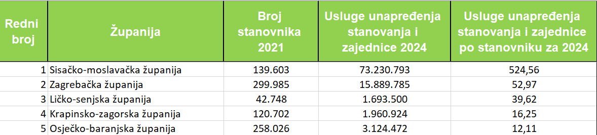Sisačko-moslavačka županija izdvojila je po stanovniku za stavku u proračunu Usluga unapređenje stanovanja i zajednice čak 524,56 eura, a iz proračuna udjel od 31,36 posto.