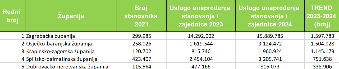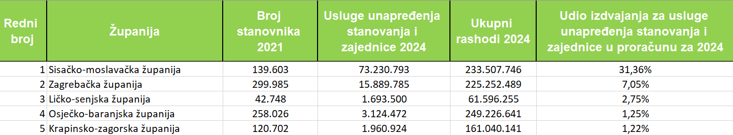 Jedanaest županija je povećalo izdvajanja unutar te stavke u 2024. u odnosu na 2023. godinu, sve su izdvojile do 10 posto proračuna, osim jedne, Sisačko-moslavačke, koja je još u fazi obnove i gradnje niza stanova za smještaj te njen udjel premašuje 30 posto. Zato se je kao i u analizi za 2023. godinu, smjestila na vodeću poziciju po izdvojenim sredstvima unutar stavke Usluge unapređenja stanovanja i zajednice.