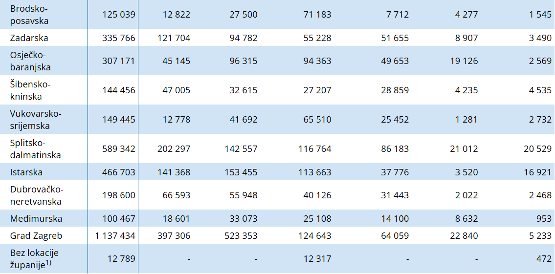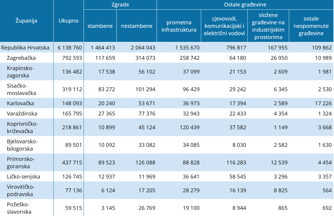 Najveći broj stambenih zgrada, od ukupno 6.343 u RH, izgrađeni su lani u Istarskoj županiji (1.156), Zadarskoj (1.022), Splitsko-dalmatinskoj (771), Gradu Zagrebu (602), Zagrebačkoj županiji (512) i Primorsko-goranskoj (420). Po površini izgrađenih stambenih zgrada također prednjače oni izgrađeni u Gradu Zagrebu, a slijede stambene zgrade u Zadarskoj, Istarskoj, Splitsko-dalmatinskoj, Zagrebačkoj i Primorsko-goranskoj županiji.