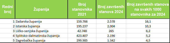 Analiziramo li objavljene podatke, odnosno stavimo li u omjer broj završenih stanova i broj stanovnika, bez Grada Zagreba, opet predvodi Zadarska županija s izgrađenim 16,1 stanom na 1.000 stanovnika, slijedi Istarska s 10,3 stana, Ličko-senjska sa 6,2 stana, Splitsko-dalmatinska s 5,2 stana i Zagrebačka županija s 4,5 stanova na 1.000 stanovnika.