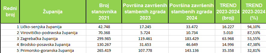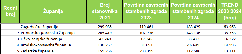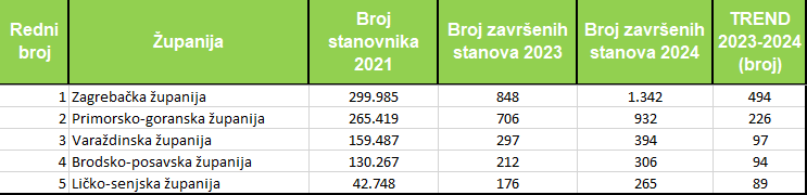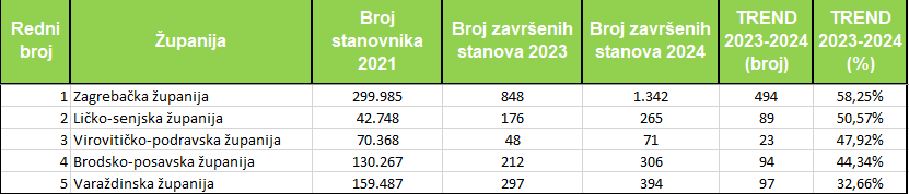 Po trendu veličine površine završenih stanova u 2024. godini, predvodi Zagrebačka županija gdje je izgrađeno gotovo 64 tisuće m2 površine stanova, u Primorsko-goranskoj za 35,4 tisuće m2, Ličko-senjskoj za 16,2 tisuće, Brodsko-posavskoj za 15 tisuća i Zadarskoj za 13,1 tisućom više četvornih metara površine stanova u 2024. u odnosu na 2023. godinu.