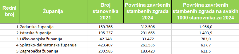 Stavi li se u omjer površina završenih stanova s brojem stanovnika, bez Grada Zagreba, predvodi opet Zadarska županija s površinom od 1.956 tisuća m2 na 1.000 stanovnika, slijedi ju Istarska s 1.494 tisuće m2, Ličko-senjska sa 783 m2, Splitsko-dalmatinska sa 618 m2 i Zagrebačka sa završenih 611,5 četvornih metara površine stanova na 1.000 stanovnika.