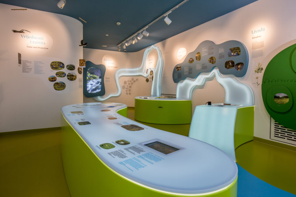 Kroz rekonstrukciju i opremanje Centra za posjetitelje Med dvemi vodami u prizemlju su postavljane dvije moderno opremljene galerije sa stalnim interpretacijskim postavom i suvenirnicom te ulaznim info pultom. U okolišu Centra nalazi se interpretacijska brvnara Moj hrast Adam te dječje igralište Rječica. Rekonstrukcijom i opremanjem edukacijsko-istraživačkog centra Matulov grunt u Frkanovcu, rekonstruirana je i prenamijenjena stara „hiža‟ u Frkanovcu, građena  prije više od stotinjak godina u duhu tradicije međimurskog kraja čime predstavlja dobro očuvani primjer seoske arhitekture Međimurja. Edukacijsko-istraživački centar posvećen je leptirima i značajnim staništima biljnih i životinjskih vrsta gornjeg Međimurja.