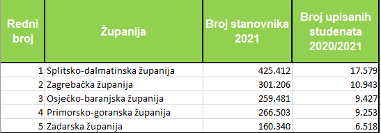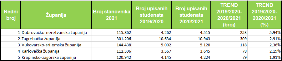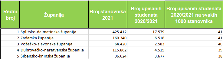U prošloj akademskoj godini 2020./2021. najveći je broj upisanih studenata bio iz Splitsko-dalmatinske županije, 17.579, u Zagrebačke 10.943, Osječko-baranjske 9.427, Primorsko-goranske 9.253 i Zadarske 6.518. Na 1.000 stanovnika najveći je broj upisanih studenata bio također iz Splitsko-dalmatinske, 41, isto kao i iz Zadarske županije, 40 iz Požeško-slavonske županiji, 39 iz Dubrovačko-neretvanske i 38 upisanih na 1.000 stanovnika iz Šibensko-kninske županije. U odnosu na prethodnu akademsku godinu najveći porast studenata upisanih na fakultete imale su Dubrovačko-neretvanska županija, s rastom od 5,94 posto, Zagrebačka s rastom od 2,91 posto, Vukovarsko-srijemska 2,36 posto, Karlovačka 2,19 posto i Krapinsko-zagorska 1,91 posto.