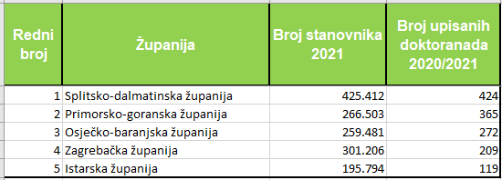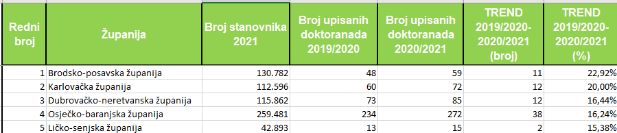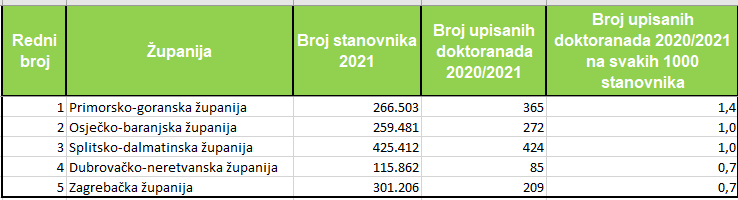 I najveći broj upisanih doktoranada imala je Splitsko-dalmatinska županija, 424, Primorsko-goranska 365, Osječko-baranjska 272, Zagrebačka 209 i Istarska 119. Po broju upisanih doktoranada na tisuću stanovnika prednjači Primorsko-goranska županija s 1,4 upisanih, Osječko-baranjska i Splitsko-dalmatinska sa 1 upisanim na svakih 1.000 stanovnika te Dubrovačko-neretvanska i Zagrebačka s upisanih 0,7 doktoranada. Brodsko-posavska županija imala je najbolji trend rasta upisanih doktoranada, za 22,92 posto, Karlovačka za 20 posto, Dubrovačko- neretvanska za 16,44 posto, Osječko-baranjska za 16,24 posto i Ličko-senjska za 15,38 posto.