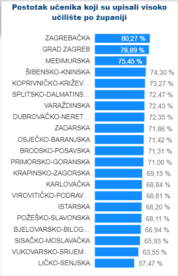 Spomenimo i da prema podacima aplikacije e Rudnik Ministarstva znanosti i obrazovanja u aktualnoj akademskoj godini najveći je postotak učenika upisanih na visoka učilišta, iz Zagrebačke županije, Zagreba, Međimurske, Šibensko-kninske, Koprivničko-križevačke i Splitsko-dalmatinske županije. (L.K.)