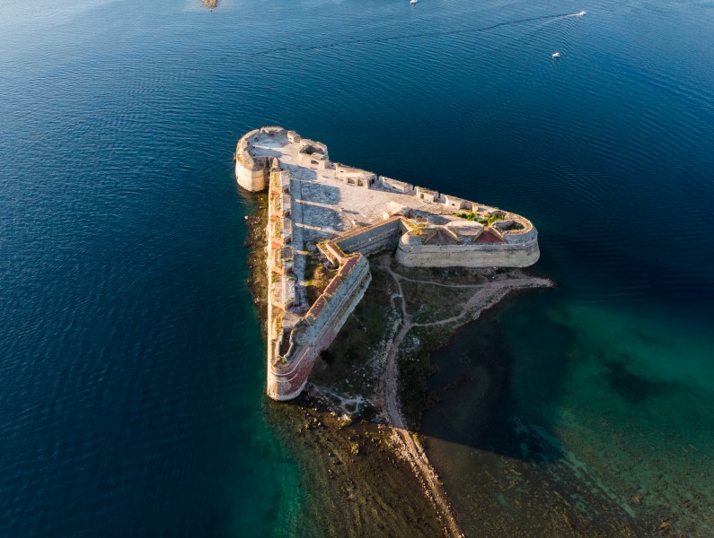 Tvrđava ima trokutastu osnovu, što je rijetkost u fortifikacijskoj arhitekturi. U sjevernom dijelu trokuta nalazi se proširenje gljivasta oblika, torion. Na torionu su, na razini mora i na nadgrađu, koncentrirani topovski otvori. Oni se nalaze i na kortinama koje idu prema polubastionima, osobito na zapadnoj strani. Prema sjevernom prolazu, dvokatna polukružna baterija za paljbu u trup broda proteže se prema istoku kako bi omogućila maksimalan broj topovskih otvora uz kanal prema otvorenom moru, odakle mogu napasti neprijateljski brodovi.