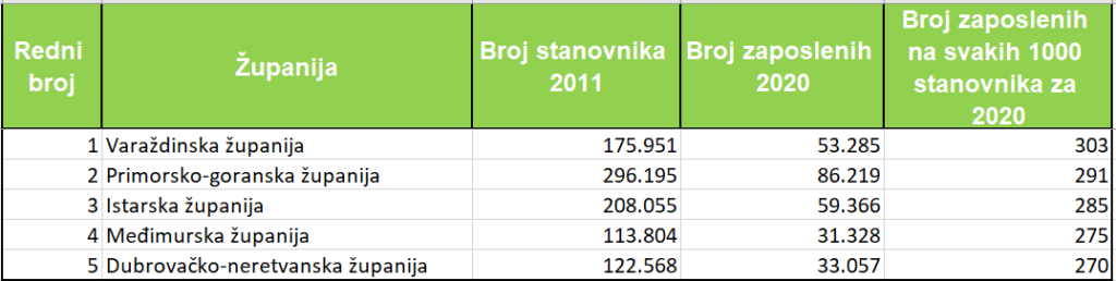 Na 1.000 stanovnika Varaždinska županija je imala najviše zaposlenih, 303, Primorsko-goranska 291 osobu, Istarska 285, Međimurska 275 i Dubrovačko-neretvanska 270.