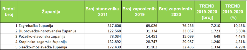 Mi smo napravili analizu županija s najvećim ukupnim brojem zaposlenih, najvećim brojem zaposlenih na 1.000 stanovnika te rasta broja zaposlenih sa 31.3.2020. u odnosu na 31.3.2019.godine.