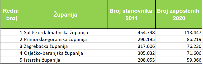 Splitsko-dalmatinska županija je imala lani najveći broj zaposlenih, 113.447 osoba, Primorsko-goranska 86.219, Zagrebačka 76.236 osobe, Osječko-baranjska 71.606 i Istarska županija 59.366 zaposlene osobe.