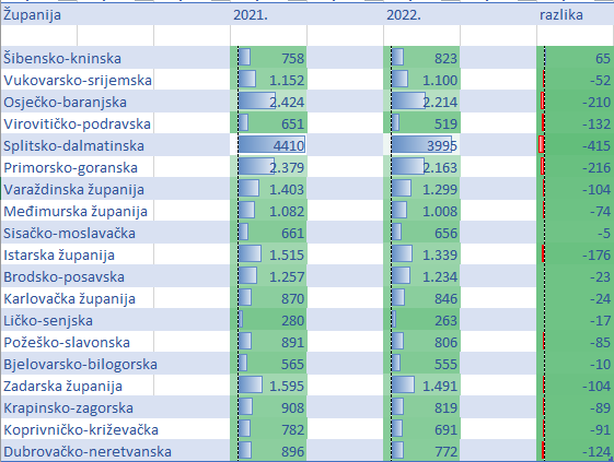 Lani su samo šibenska, kninska, vukovarska bolnica unutar županija te zagrebačka Petrova i Sestara milosrdnica (za KBC Sveti Duh nismo dobili podatke) zabilježile veći broj rođenih beba. Sve ostale imaju značajan pad. Na području Šibensko-kninske županije rođeno je više beba, i to njih 65. Najmanji pad broja rođenih beba u godinu dana imale su, pak, Sisačko-moslavačka, Ličko-senjska, Bjelovarsko-bilogorska, Brodsko-posavska, Karlovačka i Vukovarsko-srijemska županija. Na žalost, u velikom broju županija pad broja rođenih je i za preko 100 beba. Pri čemu treba ipak uzeti u obzir i veličinu rodilišta, a ono najveće je u splitskoj bolnici, gdje se godišnje rodi najviše beba. Ukupno je u bolnicama u županijama (bez Zagreba) lani rođeno 1.886 beba manje nego godinu prije.
