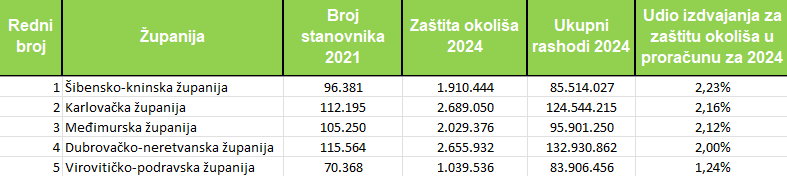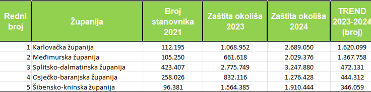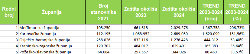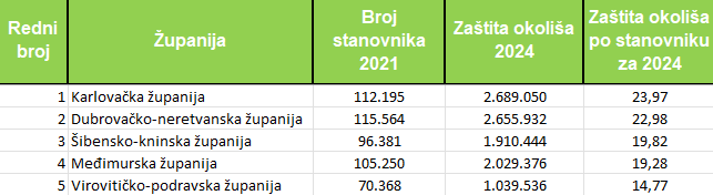 Po stanovniku je najviše za zaštitu okoliša izdvojila Karlovačka županija (24 eura), koja je ujedno imala i najveći rast izdvojenih sredstava u apsolutnom iznosu na godišnjoj razini (za 1,6 milijuna eura). Najveći udjel izdvojenih sredstava iz prošlogodišnjeg proračuna za zaštitu okoliša imala je Šibensko-kninska županija (2,23%), dok je Međimurska imala najveći relativni rast izdvojenih sredstava u odnosu na 2023. godinu (za 207%).