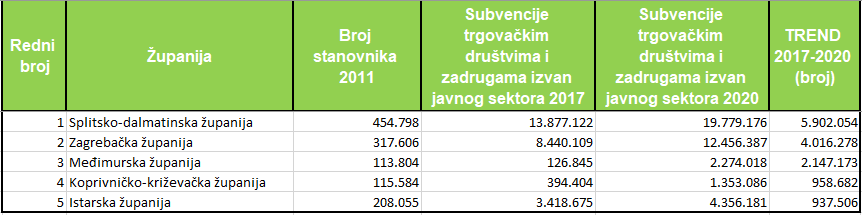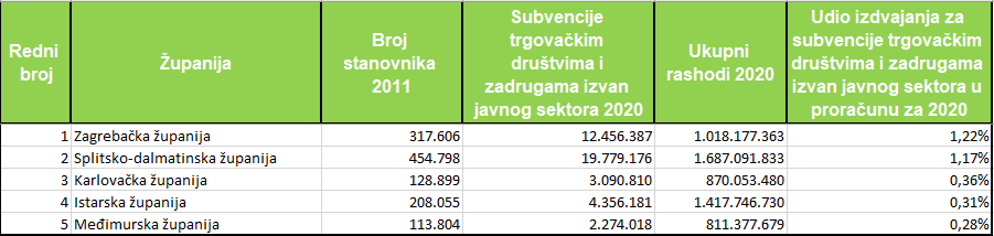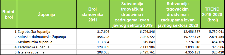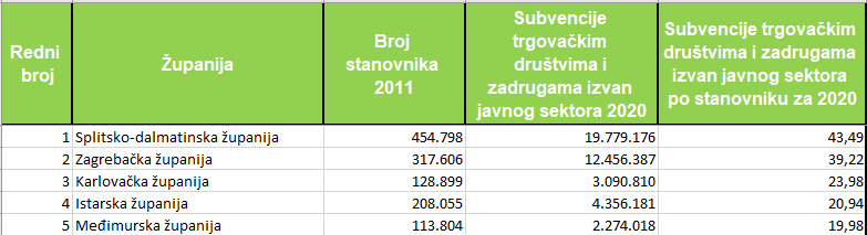 Po stanovniku najviše je za subvencije izdvojila u 2020. godini Splitsko-dalmatinska županija, 43,49 kune, Zagrebačka županija 39,22 kune, Karlovačka 23,98 kuna i Međimurska županija 19,98 kune. Po udjelu iz proračuna vodeća je Zagrebačka županija s udjelom od 1,22 posto, Splitsko-dalmatinska s udjelom od 1,17 posto, Karlovačka 0,36 posto, Istarska 0,31 i Međimurska županija 0,28 posto.