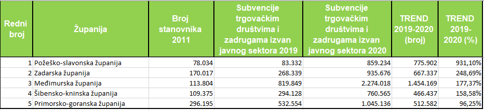 U odnosu na 2019. godine najveći rast izdvojenih proračunskih sredstava za subvencije imale su u 2020. godini Zagrebačka županija, za 5,7 milijuna kuna, Splitsko-dalmatinska za gotovo 2,7 milijuna, Međimurska za 1,4 milijuna, Karlovačka 977 tisuća i Istarska županija 926,4 tisuće kuna više. U relativnom iznosu rast je bio najveći u Požeško-slavonskoj županiji, za 931,1 posto, Zadarskoj 248,69 posto, Međimurskoj 177,37 posto, Šibensko-kninskoj 158,58 posto i Primorsko-goranskoj 96,25 posto.