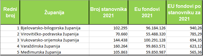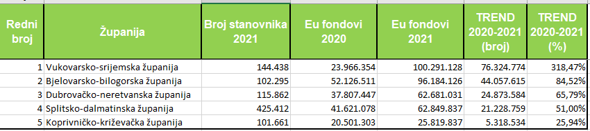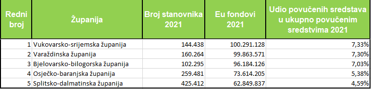 Kako pokazuju podaci Ministarstva financija o izvršenju proračuna za 2021. godinu (podaci za 2022. još nisu dostupni), najviše je te godine povukla Vukovarsko-srijemska županija povukla je u 2021. godini – čak 7,33 posto ukupno povučenih sredstava. Slijede Varaždinska županija sa 7,30 posto, Bjelovarsko-bilogorska sa 7,03 posto, Osječko-baranjska sa 5,38 posto i Splitsko-dalmatinska županija sa 4,59 posto. Po stanovniku, najviše je povukla Bjelovarsko-bilogorska županija – 940,26 kuna, Virovitičko-podravska županija 785,29 kuna, Vukovarsko-srijemska 694,35 kuna, Varaždinska 623,12 kuna i Međimurska županija 565,36 kuna. Vukovarsko-srijemska županija imala je i najveći rast povučenih sredstava u odnosu na 2020. godinu, za 318,47 posto, Bjelovarsko-bilogorska je imala rast od 84,52 posto, Dubrovačko-neretvanska 65,79 posto, Splitsko-dalmatinska 51 posto i Koprivničko-križevačka županija 25,94 posto.