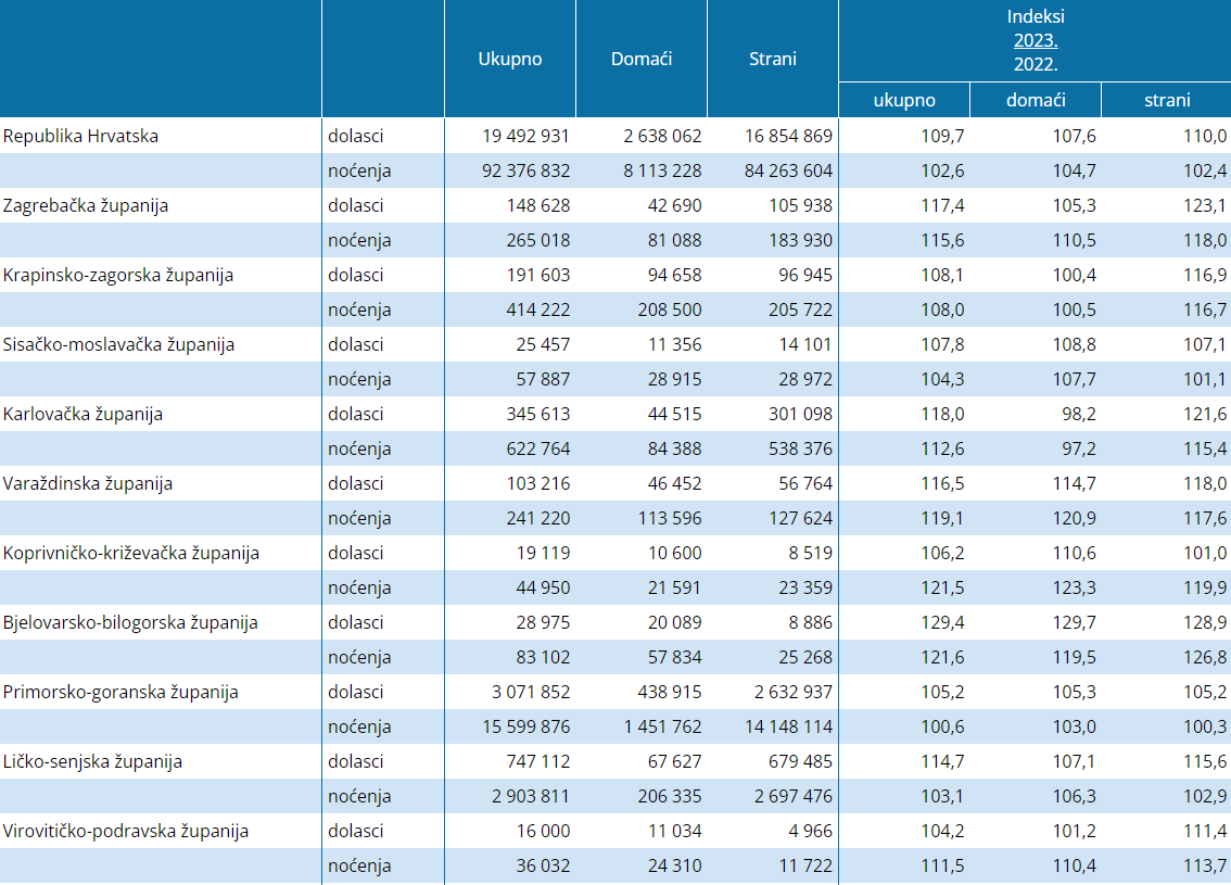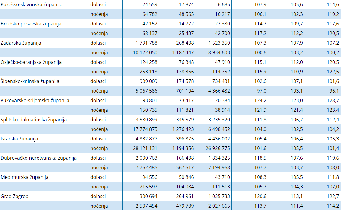 Po rastu dolazaka u odnosu na 2022. godinu, pokazuju nadalje podaci, predvodi Bjelovarsko-bilogorska županija s rastom od 29.4 posto, Vukovarsko-srijemska županija s rastom od 24,2 posto, Zagreb s rastom dolazaka turista od 20,6 posto, Dubrovačko-neretvanska s rastom od 18,5 posto, Karlovačka s 18 posto i Zagrebačka koja je ostvarila rast dolazaka turista za 17,4 posto na godišnjoj razini. Po rastu broja noćenja predvodi Vukovarsko-srijemska županija, za 21,9 posto, Bjelovarsko-bilogorska za 21,6 posto, Koprivničko-križevačka za 21,5 posto, Varaždinska za 19,5 posto i Brodsko-posavska za 17,2 posto.