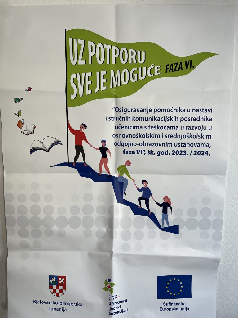 „Uz potporu sve je moguće, faza VI“ projekt je koji je omogućio inkluzivno obrazovanje za 57 učenika s teškoćama u razvoju u osnovnoškolskim i srednjoškolskim odgojno obrazovnim ustanovama kojima je osnivač Bjelovarsko – bilogorska županija.