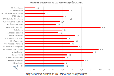 Ostvareni broj prikupljenih doza krvi na 100 stanovnika u Republici Hrvatskoj (broj stanovnika 3.871.833 prema popisu iz 2021. godine) iznosi 5,23 doza krvi, a ostvareni broj doza krvi prikupljenih na organiziranim akcijama društava Hrvatskog Crvenog križa, iznosi 4,17 doze krvi na 100 stanovnika, stoji u izvješću o radu Hrvatskog Crvenog križa.