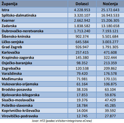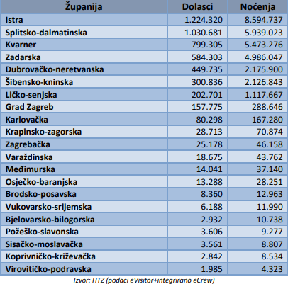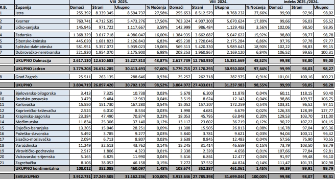 Vodeće su sve redom jadranske županije. Na kontinentu, nakon Grada Zagreba s ostvarenih 288,6 tisuća noćenja, slijede: Karlovačka sa 167,3 tisuće, Krapinsko-zagorska sa 70,9 tisuća, Zagrebačka s 46,2 tisuće, Varaždinska s 43,8 tisuća i Međimurska s 37,1 tisućom noćenja u kolovozu.
