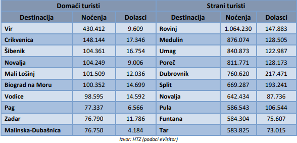 Najpoželjnije destinacije u kolovozu su za strance bile su četiri istarske – Rovinj, Medulin, Umag i Poreč, slijede Dubrovnik, Split, Novalja, Pula, Funtana i Tar. Domaćim turisti najviše su posjetili Vir, Crikvenicu, Šibenik, Novalju, Mali Lošinj, Biograd na Moru, Vodice, Pag, Zadar i Malinsku.