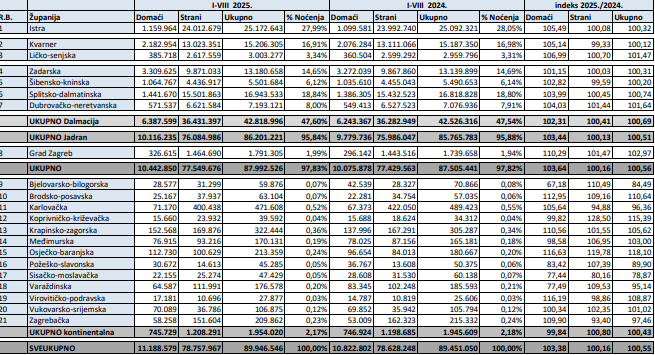 I u osam ovogodišnjih mjeseci poredak vodećih pet županija po broju ostvarenih noćenja i dolazaka je isti kao i u kolovozu. Istra je tako imala 25,2 milijuna noćenja, Splitsko-dalmatinska 16,9 milijuna, Kvarner 15,2 milijuna, Zadarska županija 13,2 milijuna i Dubrovačko-neretvanska 7,2 milijuna. Na kontinentu, nakon Grada Zagreba, najveći broj noćenja također je ostvarila, kao i u kolovozu, Karlovačka županija, 471,6 tisuća, Krapinsko-zagorska 322,4 tisuće, Osječko-baranjska 213,4 tisuće, Zagrebačka 209,9 tisuća i Varaždinska županija 176,6 tisuća noćenja.