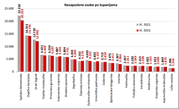 U usporedbi s istim mjesecom prošle godine evidentirana je nezaposlenost smanjena u jedanaest županija, a povećana u deset županija. Najveći pad broja nezaposlenih evidentiran je u Istarskoj (za 9,8 %), Splitsko-dalmatinskoj (za 8,6 %), Dubrovačko-neretvanskoj županiji (za 8,3 %), Gradu Zagrebu (za 5,2 %), Karlovačkoj (3,9 posto) i Primorsko-goranskoj (3,8 posto). Na mjesečnoj razini nezaposlenost je bila manja tek u 5 županija, a najviše u Gradu Zagrebu i Zagrebačkoj županiji.