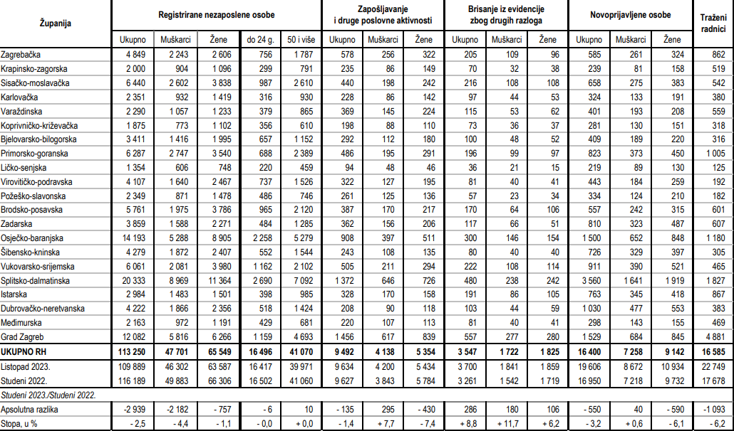 Potkraj studenog 2023. u Hrvatskome zavodu za zapošljavanje bilo je evidentirano 113.250 nezaposlenih osoba, što je za 3.361 osobu ili 3,1 posto više nego prethodnoga mjeseca, a za 2.939 osoba ili 2,5 posto manje nego u studenom 2022. Tako je u studenom 2023. godine nezaposlenost povećana za 3,1 % u usporedbi s prethodnim mjesecom, a smanjena za 2,5 % u usporedbi s istim mjesecom 2022. godine.