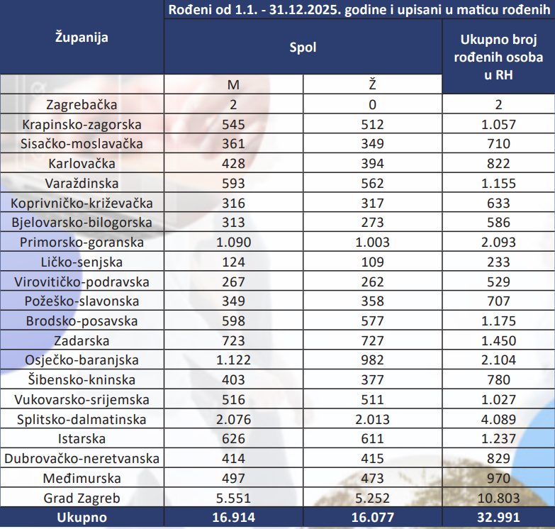 Prema podacima Matice rođenih lani je u hrvatskim bolnicama rođeno 32.991 beba, što je u odnosu na podatke Matice za 2024. godinu porast rođenih za 363! I nakon nekoliko godina, opet promjena trenda u plus. Najveći porast rođenih, odnosno upisanih u Maticu, bio je u rodilištima u Sisačko-moslavačkoj, Krapinsko-zagorskoj, Međimurskoj, Primorsko-goranskoj, Gradu Zagrebu i Ličko-senjskoj županiji.