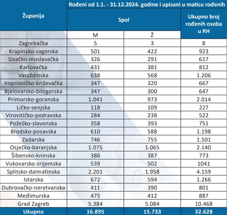 Usporede li se podaci s onima iz 2024., najveći porast rođenih, odnosno upisanih u maticu, bio je u rodilištima u Sisačko-moslavačkoj županiji (+15,07 posto), Krapinsko-zagorskoj (+14,52 posto), Međimurskoj (+9,36 posto), Primorsko-goranskoj (+3,92 posto), Gradu Zagrebu (+3,2 posto) i Ličko-senjskoj županiji (+2,64 posto).
