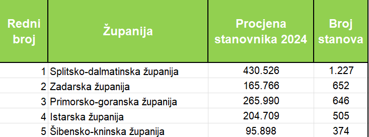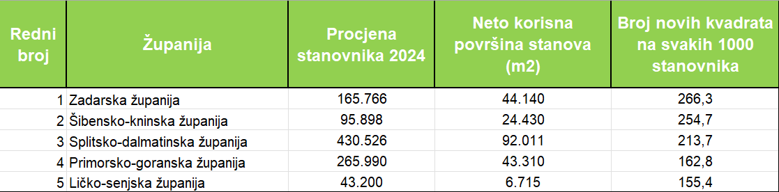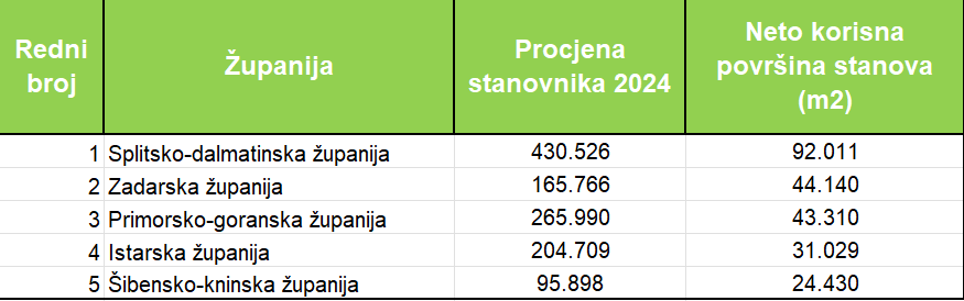 Ukupno je riječ o gotovo 563 tisuće m2 neto korisne površine, a najveća je u Splitsko-dalmatinskoj županiji (92.011 m2), Zadarskoj (44.140 m2), Primorsko-goranskoj (43.310 m2), Istarskoj (31.029 m2) i Šibensko-kninskoj (24.430 m2). Na svakih 1.000 stanovnika najveći broj kvadrata unutar POS stanova dobila je Zadarska županija (266,3 m2), Šibensko-kninska (254,7 m2), Splitsko-dalmatinska (213,7 m2), Primorsko-goranska (162,8 m2) i Ličko-senjska županija (155,4 m2).