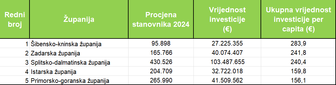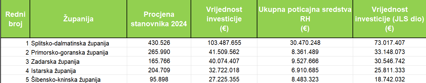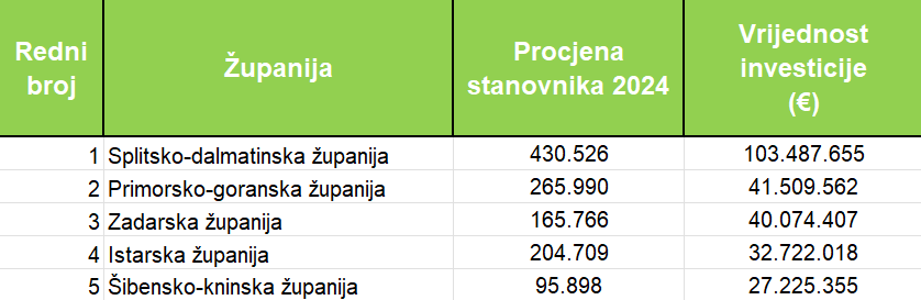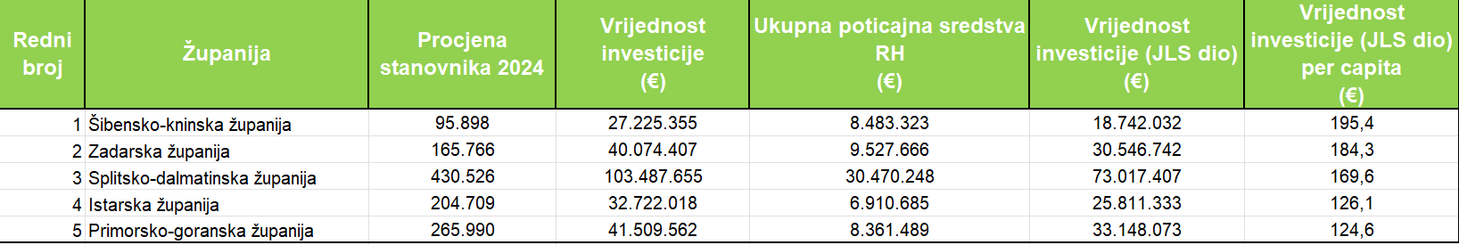 Gleda li se udjel pojedinih gradova i općina unutar pojedine županije u investiciji gradnje POS stanova, poredak je isti kao i sama njihova vrijednost. Tako su gradovi i općine u Splitsko-dalmatinskoj županiji izdvojili za gradnju POS stanova 73 milijuna eura, u Primorsko-goranskoj 33,1 milijun, Zadarskoj 30,5 milijuna eura, Istarskoj 25,8 milijuna te gradovi i općine u Šibensko-kninskoj županiji 18,7 milijuna eura. Najveći udjel u investiciji gradnje POS stanova u odnosu na broj stanovnika imali su gradovi i općine u Šibensko-kninskoj županiji (195,4 eura), Zadarskoj (184,3 eura), Splitsko-dalmatinskoj (169,6 eura), Istarskoj (126,1 euro) i Primorsko-goranskoj (124,6 eura).