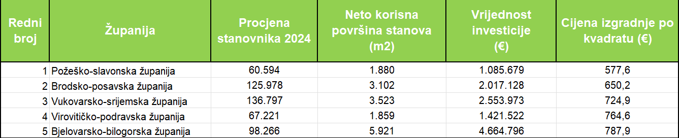 Na kraju smo analizirali i trošak gradnje po kvadratu. Najniža je bila cijena po m2 u POS zgradama u Požeško-slavonskoj županiji (577,6 eura po m2), Brodsko-posavskoj (650 eura po m2), Vukovarsko-srijemskoj (725 eura za m2), Virovitičko-podravskoj (765 eura za m2) i Bjelovarsko-bilogorskoj (788 eura za m2). Najveća cijena bila je u Sisačko-moslavačkoj i Splitsko-dalmatinskoj županiji. (L. Kiseljak)