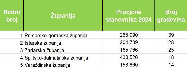Kako je pokazala naša analiza, od ukupno 246 izgrađenih POS zgrada, nakon Zagreba na koji se odnosi četvrtina izgrađenih zgrada, najveći broj je u Primorsko-goranskoj županiji (39), Istarskoj (28), Zadarskoj (25), Splitsko-dalmatinskoj (18) i Varaždinskoj županiji (14). U njima se nalazi 7.993 stana, a najveći broj u Splitsko-dalmatinskoj županiji (1.227), Zadarskoj (652), Primorsko-goranskoj (646), Istarskoj (505) i Šibensko-kninskoj (374). U odnosu na broj stanovnika, najveći broj POS stanova izgrađeno je u Zadarskoj i Šibensko-kninskoj županiji, 3,9 na 1000 stanovnika, u Splitsko-dalmatinskoj 2,9 na 1000 stanovnika, Ličko-senjskoj i Istarskoj 2,5, Primorsko-goranskoj 2,4 i Dubrovačko-neretvanskoj 2 stana na 1.000 stanovnika.