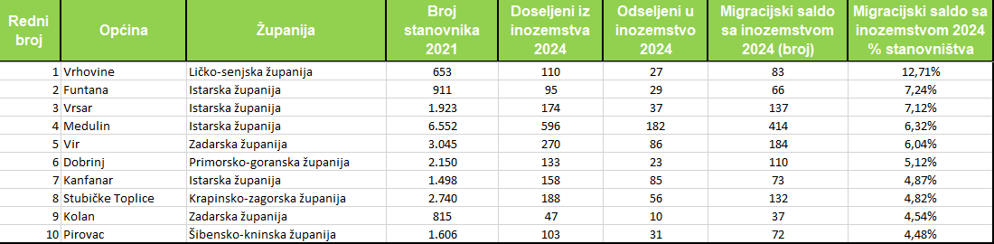 Najveći ukupan migracijski saldo imao je Medulin, a slijede Podstrana, Viškovo, Župa dubrovačka, Vir, Poličnik, Stupnik, Rugvica, Dugopolje i Okrug. Stavi li se omjer u postotke, tada  u vodećih deset ima i manjih općina. Predvode Vrhovine, Vir, Medulin, Funtana, Vrsar, Dobrinj, Kanfanar, Okrug, Karlobag i Stubičke Toplice.