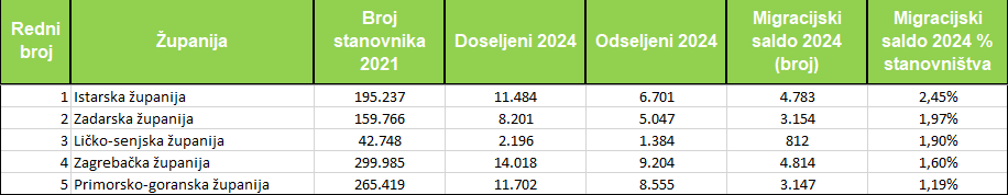 Ne računa li se Zagreb, najveći ukupan migracijski saldo imale su lani Velika Gorica, Zadar, Pula, Poreč, Kaštela, Varaždin, Rijeka, Sveta Nedelja, Dubrovnik i Dugo Selo. No, gleda li se migracijski saldo u relativnom iznosu, tada predvode mali gradovi, a prvih devet su redom uz obalu. Vodeća je Novalja, a slijede Nin, Poreč, Vodice, Supetar, Pag, Vodnjan, Biograd na Moru, Krk i Dugo Selo.
