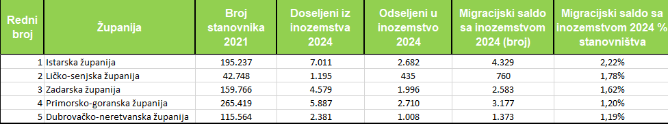 Najveću razliku (više doseljenih nego odseljenih iz županija u inozemstvo) imao je s preko 7,5 tisuća osoba Grad Zagreb, a slijede Splitsko-dalmatinska, Istarska, Primorsko-goranska, Zagrebačka i Zadarska županija. Najbolju postotnu razliku doseljenih i odseljenih imale su Istarska, Ličko-senjska, Zadarska, Primorsko-goranska i Dubrovačko-neretvanska županija.