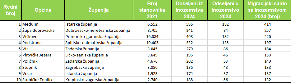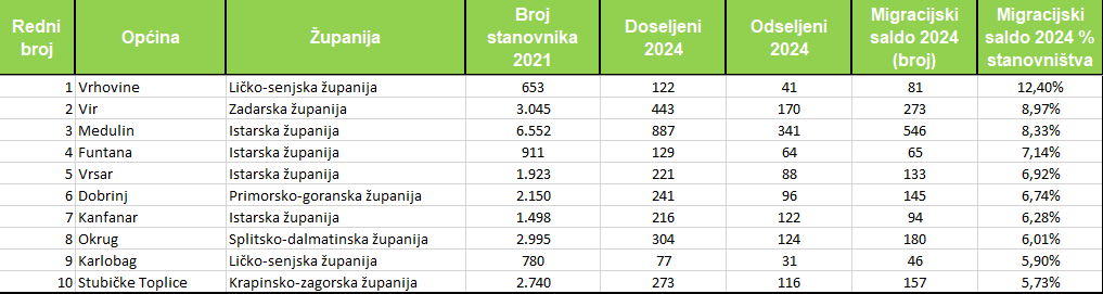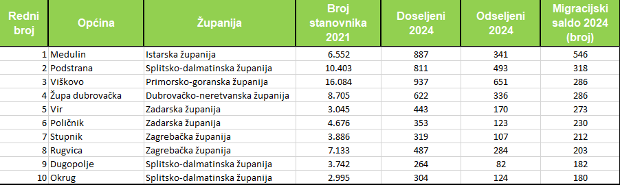 Najveći ukupan migracijski saldo imao je Medulin, a slijede Podstrana, Viškovo, Župa dubrovačka, Vir, Poličnik, Stupnik, Rugvica, Dugopolje i Okrug. Stavi li se omjer u postotke, tada  u vodećih deset ima i manjih općina. Predvode Vrhovine, Vir, Medulin, Funtana, Vrsar, Dobrinj, Kanfanar, Okrug, Karlobag i Stubičke Toplice.