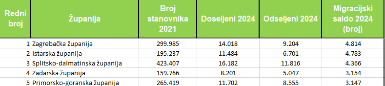 U devet županija je u odnosu na 2023. godinu bilo manje doseljenih iz inozemstva. Ali zato u Zagrebu za oko 1,1 tisuću više, blizu 500 više u Zagrebačku županiju, za preko 300 više u Krapinsko-zagorsku, oko 200 više u Sisačko-moslavačku, nešto više od 100 više u Požeško-slavonsku, Primorsko-goransku, Dubrovačko-neretvansku i Virovitičko-podravsku…