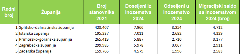 Grad Zagreb doselilo se je lani iz inozemstva najviše, 15.306 osoba, u Splitsko-dalmatinsku županiju 7.966 osoba, Istarsku 7.011, Zagrebačku 5.978 osoba, Primorsko-goransku 5.887 i Zadarsku županiju 4.579 osoba.