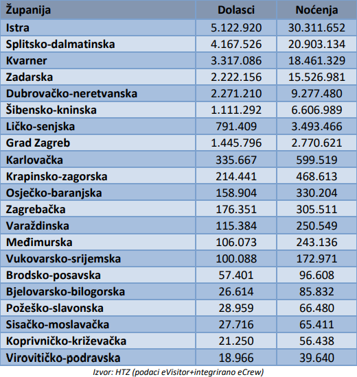Tijekom cijele prošle godine Istra je zabilježila najveći apsolutni broj noćenja (30,3 milijuna), ispred Splitsko-dalmatinske županije (20,9 milijuna),  Kvarnera (18,5 milijuna), Zadarske županije (15,5 milijuna) i Dubrovačko-neretvanske županije (9,3 milijuna).
