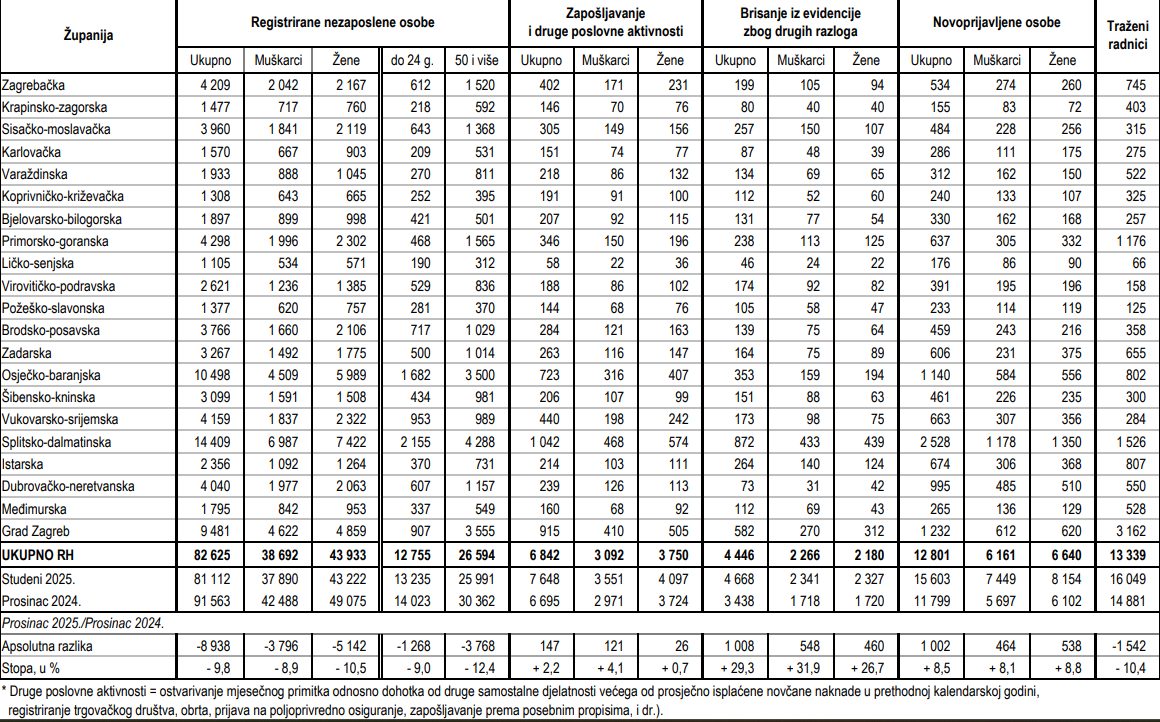 REGISTRIRANA NEZAPOSLENOST I ZAPOŠLJAVANJE U REPUBLICI HRVATSKOJ, PROSINAC 2025