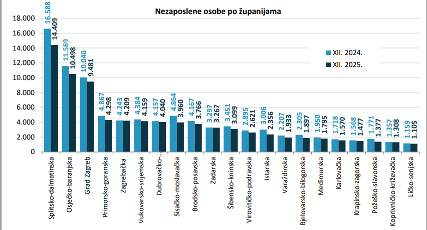 Za 9,8 posto je smanjena nezaposlenost na kraju prosinca prošle godine u odnosu na isto razdoblje 2024. godine, pokazuju objavljeni podaci Hrvatskog zavoda za zapošljavanje. Manje nezaposlenih imale su sve županije, a najveći pad bilježe Požeško-slavonska, Istarska, Sisačko-moslavačka, Bjelovarsko-bilogorska i Splitsko-dalmatinska županija.