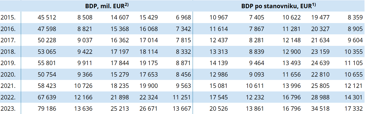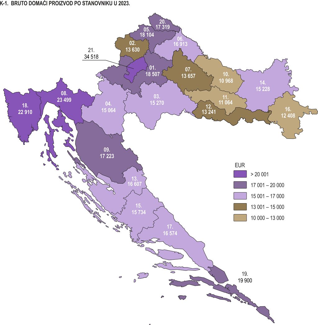 BDP po stanovniku u 2023. godini bio je gotovo 3 tisuće eura veći nego godinu prije i iznosio je 20.526 eura. Najveći je nakon Grada Zagreba, bio u Primorsko-goranskoj, Istarskoj, Dubrovačko-neretvanskoj, Zagrebačkoj i Varaždinskoj županiji. Pokazuju to objavljeni podaci Državnog zavoda za statistiku.