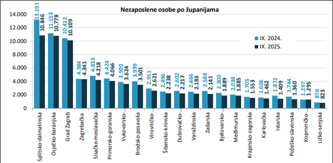 Krajem rujna 2025. godine u evidenciji Hrvatskoga zavoda za zapošljavanje registrirano je 74.559 nezaposlenih osoba. U odnosu na prethodni mjesec broj nezaposlenih smanjen je za 1,2% ili 936 osoba, a u usporedbi s rujnom 2024. godine broj nezaposlenih smanjen je za 10% ili 8.280 osoba.