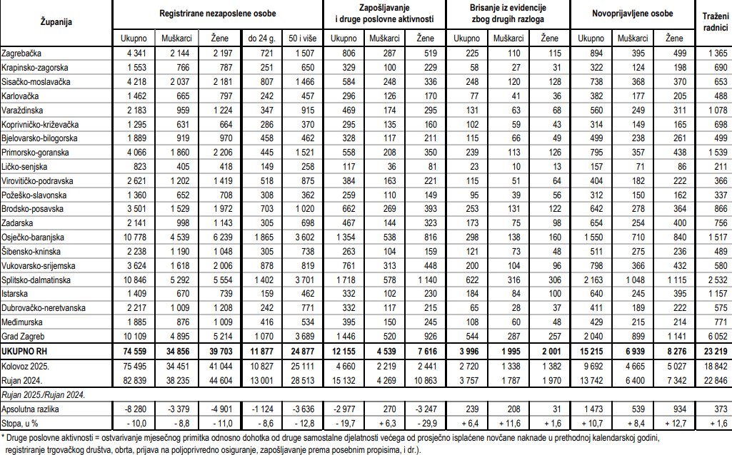 Tijekom rujna 2025. u evidenciju nezaposlenih prijavilo se 15.215 osoba, što je za 10,7 % više nego istoga mjeseca prošle godine. U ukupnome broju novoprijavljenih 11.757 osoba (77,3 %) imalo je prethodno radno iskustvo, a najviše u djelatnostima: smještaj te priprema i usluživanje hrane (1.946 ili 16,6 %), prerađivačka industrija (1.528 ili 13 %), trgovina na veliko i na malo (1.521 ili 12,9 %), obrazovanje (1.335 ili 11,4 %) te građevinarstvo (942 ili 8 %). Manje novoprijavljenih nego lanjskog rujna bilo je u svega pet županija – Bjelovarsko-bilogorskoj, Primorsko-goranskoj, Požeško-slavonskoj, Virovitičko-podravskoj i Dubrovačko-neretvanskoj županiji.