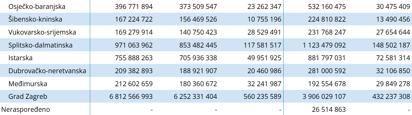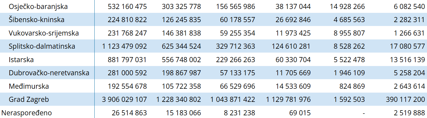 Nakon Grada Zagreba sa 6,8 milijardi vrijednim investicijama prema kriteriju sjedišta investitora, slijede: ulagači iz Zagrebačke županije koji su investirali u novu i rabljenu dugotrajnu imovinu milijardu eura, iz Splitsko-dalmatinske županije 971,1 milijun eura, Primorsko-goranske 906,5 milijuna eura,  Istarske 755,9 milijuna i Osječko-baranjske 396,8 milijuna eura.
