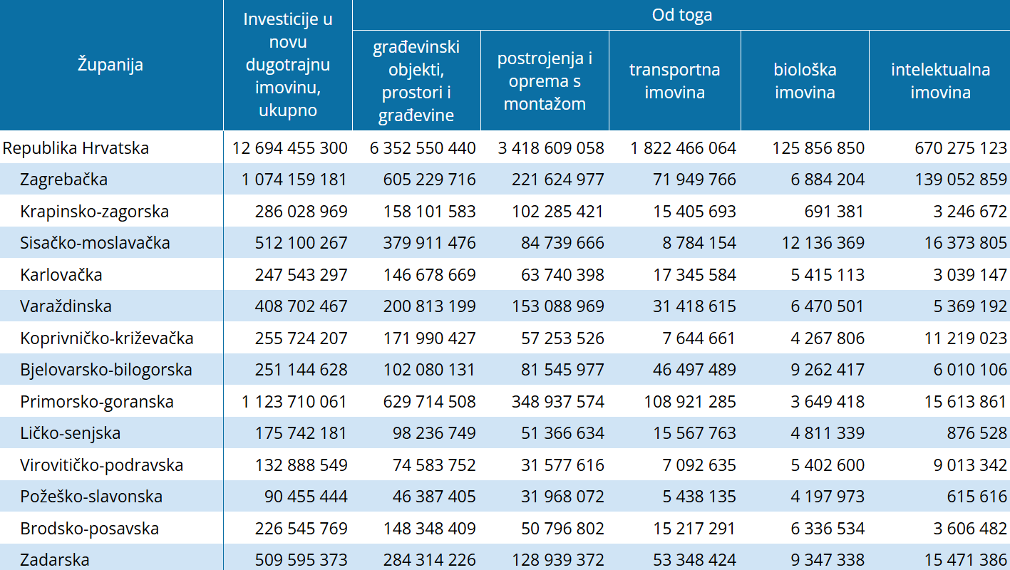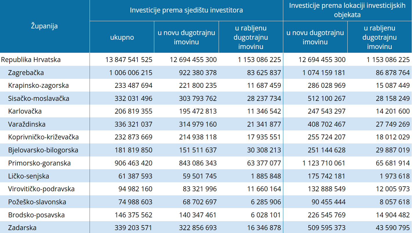 Vrijednost istraživanjem obuhvaćenog dijela bruto investicija u novu i rabljenu dugotrajnu imovinu u 2024. pokazuje nominalni pozitivan trend od 4,9%. Nominalni pozitivan trend bruto investicija u novu dugotrajnu imovinu iznosio je 4,5%. Nakon Grada Zagreba, najviše je uloženo u investicijske objekte na području Zagrebačke, Primorsko-goranske, Splitsko-dalmatinske, Istarske i Osječko-baranjske županije. Kod nove imovine u top pet priključuje se i Sisačko-moslavačka županija, pokazuju podaci Državnog zavoda za statistiku.